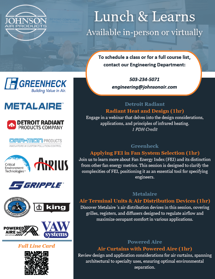 Johnson Air Products offers continuing education for brands like Greenheck, Metalaire, Airius, and Critical Environment Technologies. For a full course list or to schedule a lunch and learn, contact us at engineering@johnsonair.com or call 503-234-5071.